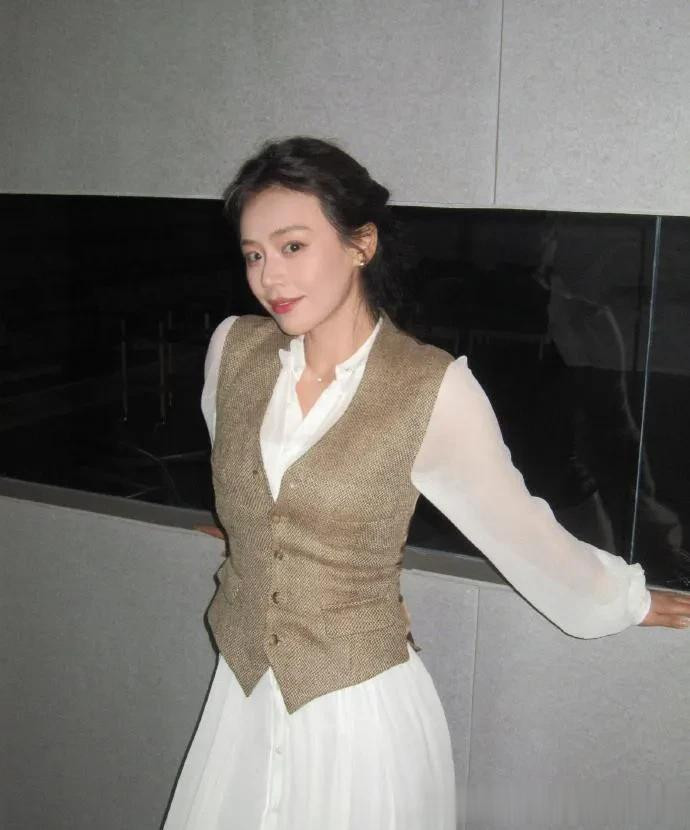 > 马思纯瘦身成功后真时髦! 穿白色衬衫裙+V领马甲, 简约又高级!